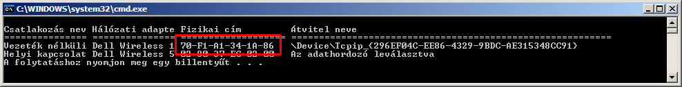 Ebben a listában kell megkeresni a vezeték nélküli hálózat MAC címét (a képen pirossal van kiemelve).